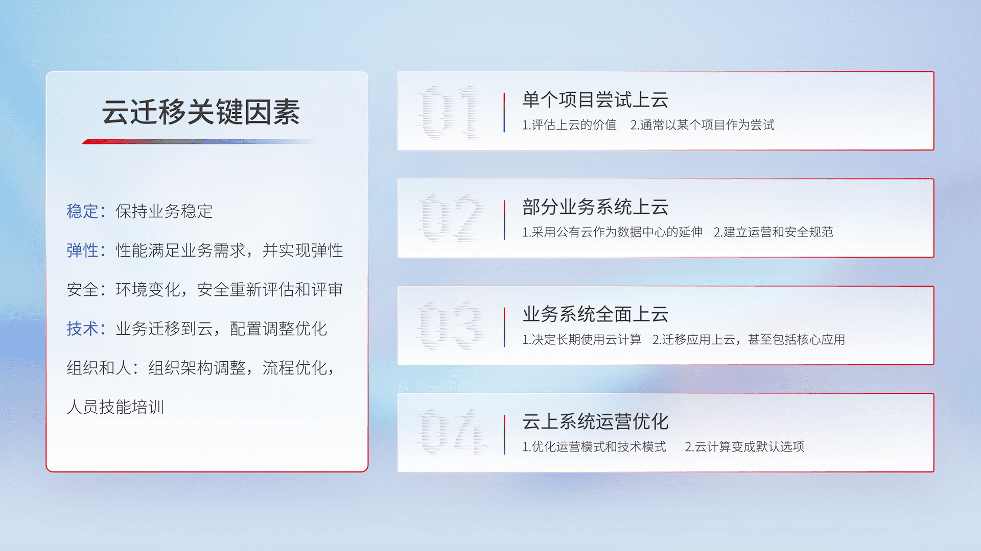 结合实际业务,,,从规划设计、、、、云平台选型、、、云原生改造、、、数据迁移、、、、集成交付,,迁移全过程为客户识别最佳上云路径,,,做好风险识别管理,,,,设计网络架构、、、、身份权限、、、安全审计合规、、、、操作审计、、、、日志审计、、监控告警策略、、多站点容灾设计等,,对云上基础设施进行整体规划,,,,提升IT治理水平,,,以满足弹性、、高可用、、高性能的需求。。。。
